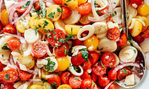 Ingredients 3 cups cherry tomatoes, sliced in half 1 15-ounce can hearts of palm, drained and sliced...