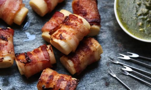 Ingredients 5 strips of bacon, sliced in half lengthwise 5 whole hearts of palm (from one 15-ounce c...